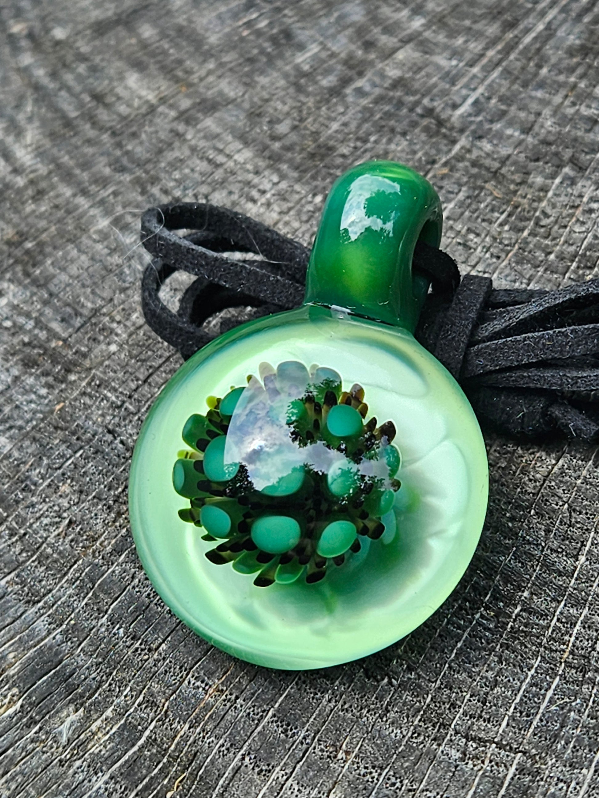 Backed with gleaming Chromium, this pendant reflects like the polished hull of a spacecraft drifting in deep space. The implosion itself is infused with Galaxy, scattering subtle star-like sparkles that float within the glass. The contrast of the metallic backing and the cosmic shimmer creates a piece that feels both futuristic and infinite, like peering into a window of the unknown.